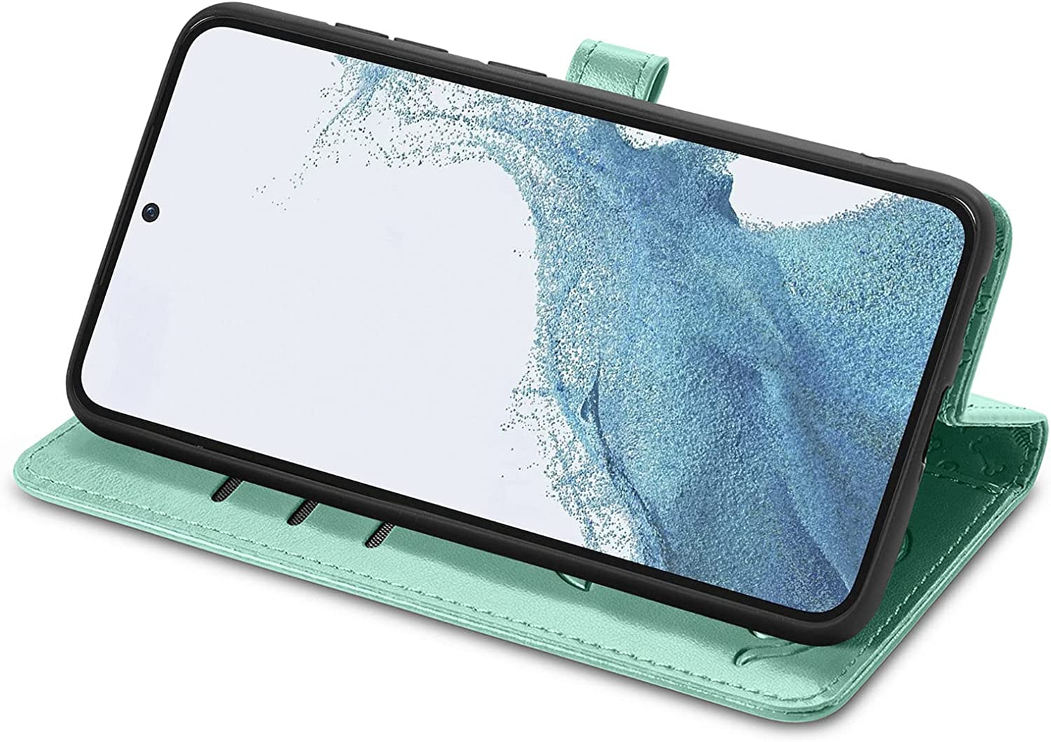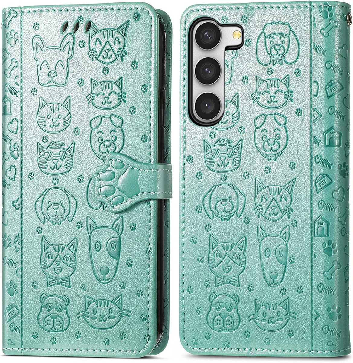 Žymos: Cat-Dog dizainas, kokybiškas dėklas, magnetinis užraktas, patogus dėklas, Samsung Galaxy A54 5G, telefono apsauga, telefono dėklas, žalias dėklas